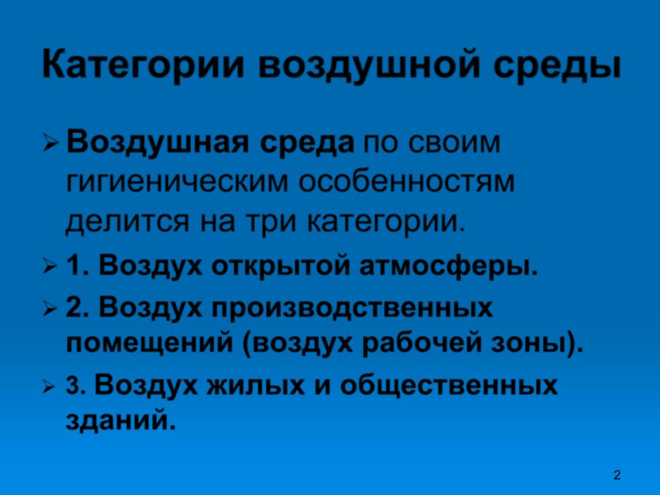 Воздушная среда по своим гигиеническим особенностям делится на три категории.