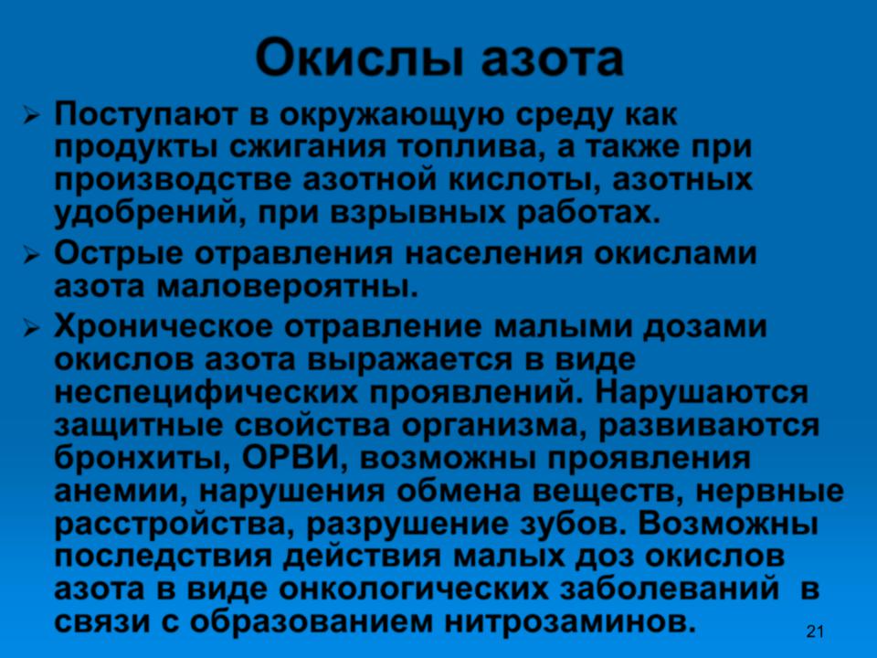 расстройства, разрушение зубов. Возможны последствия действия малых доз окислов азота в виде онкологических заболеваний в