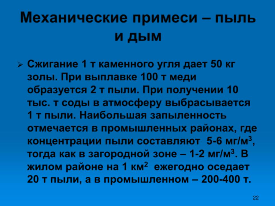 Сжигание 1 т каменного угля дает 50 кг золы. При выплавке 100 т меди образуется 2 т пыли. При получении 10 тыс. т соды в атмосферу выбрасывается 1 т пыли. Наибольшая запыленность отмечается в промышленных районах, где