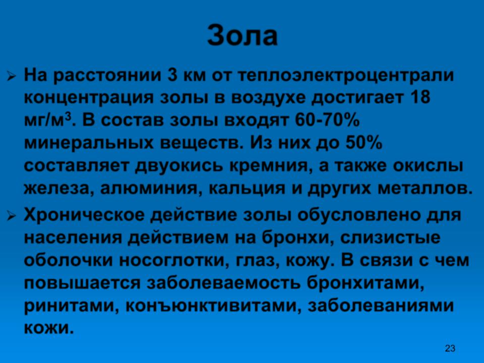 На расстоянии 3 км от теплоэлектроцентрали концентрация золы в воздухе достигает 18 мг/м3. В состав золы входят 60-70% минеральных веществ. Из них до 50% составляет двуокись кремния, а также окислы железа, алюминия, кальция и других металлов.