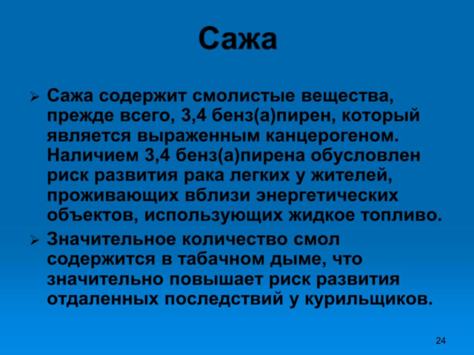 Сажа содержит смолистые вещества, прежде всего, 3,4 бенз(а)пирен, который является выраженным канцерогеном. Наличием 3,4 бенз(а)пирена обусловлен риск развития рака легких у жителей, проживающих вблизи энергетических объектов, использующих жидкое топливо.