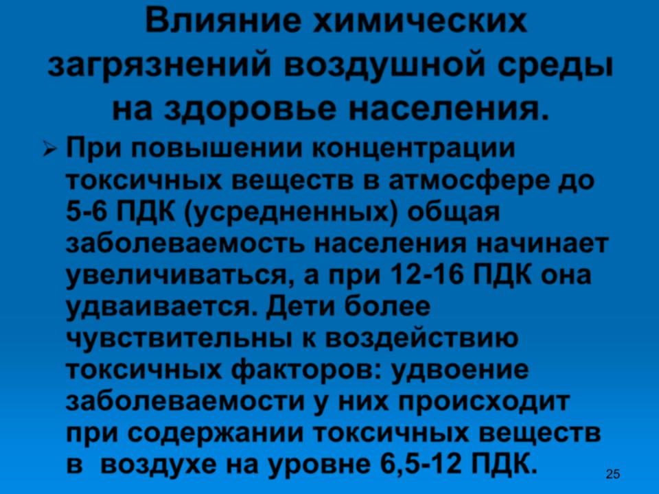 При повышении концентрации токсичных веществ в атмосфере до 5-6 ПДК (усредненных) общая заболеваемость населения начинает увеличиваться, а при 12-16 ПДК она удваивается. Дети более