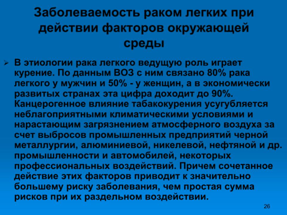 В этиологии рака легкого ведущую роль играет курение. По данным ВОЗ с ним связано 80% рака легкого у мужчин и 50% - у женщин, а в экономически развитых странах эта цифра доходит до 90%. Канцерогенное влияние табакокурения усугубляется неблагоприятными климатическими условиями и нарастающим загрязнением атмосферного воздуха за счет выбросов промышленных предприятий черной