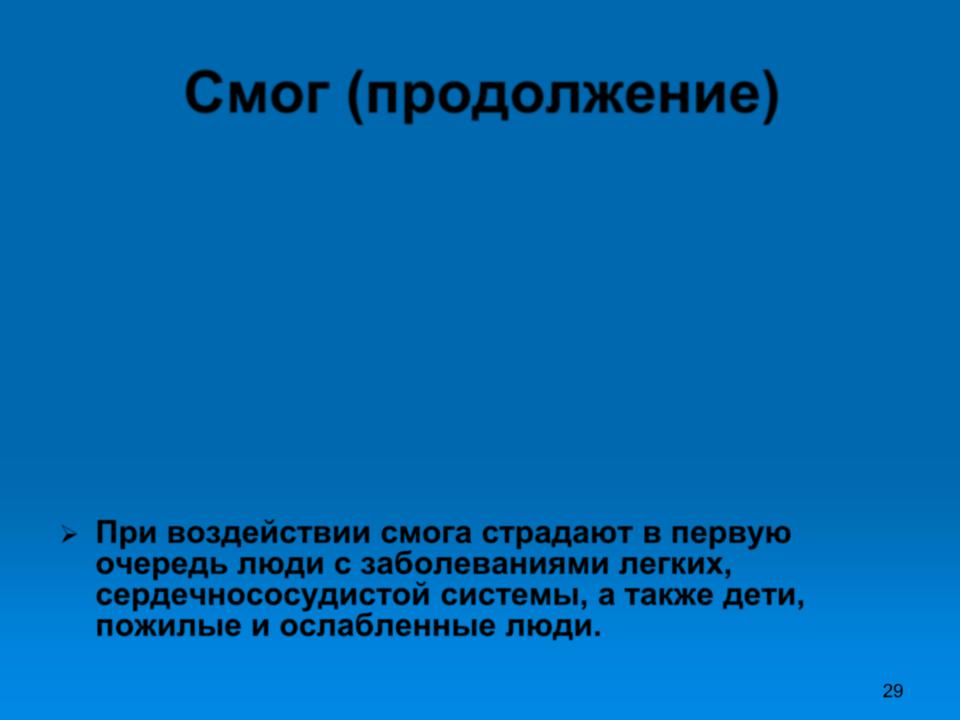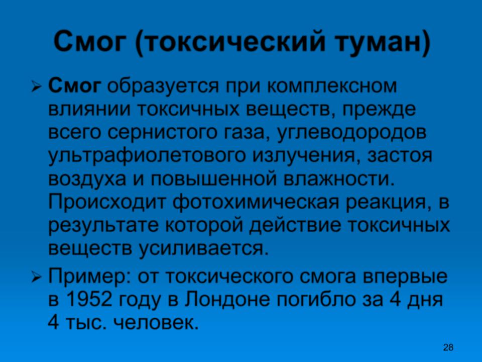 Смог образуется при комплексном влиянии токсичных веществ, прежде всего сернистого газа, углеводородов ультрафиолетового излучения, застоя воздуха и повышенной влажности. Происходит фотохимическая реакция, в результате которой действие токсичных веществ усиливается.