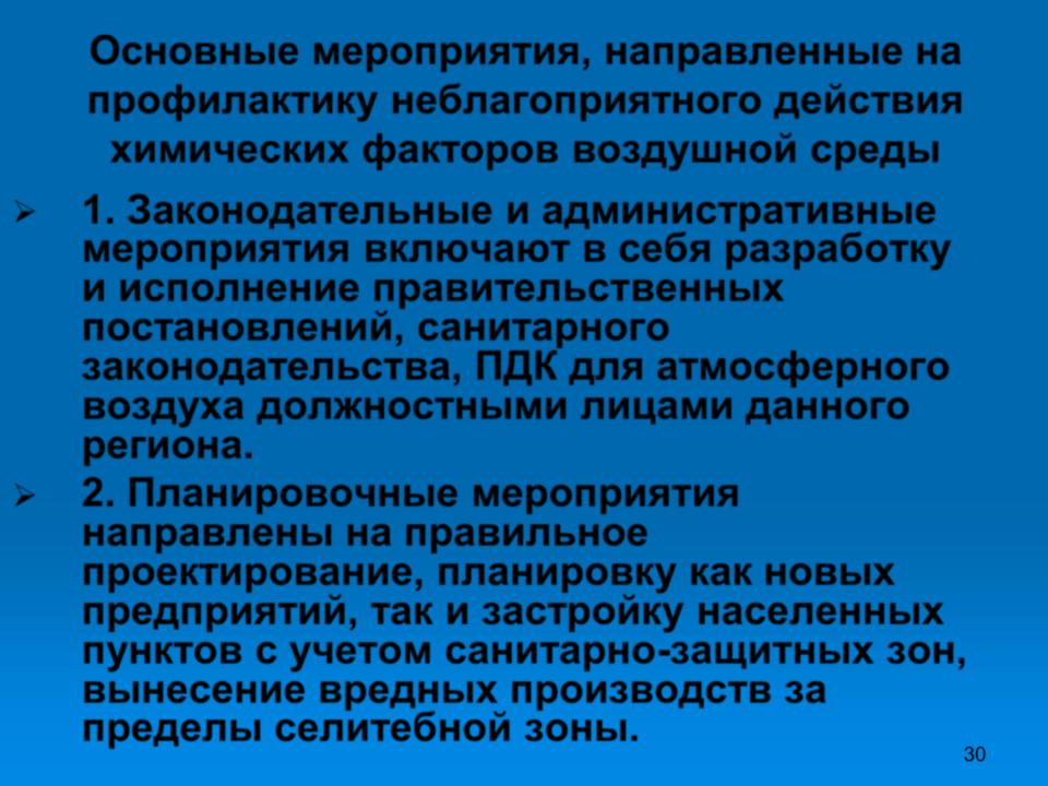 1. Законодательные и административные мероприятия включают в себя разработку и исполнение правительственных постановлений, санитарного законодательства, ПДК для атмосферного воздуха должностными лицами данного региона.