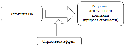Таким образом, на основе анализа релевантной литературы можно прийти к выводу о том, что, во-первых, элементы Интеллектуального капитала влияют на результаты деятельности компании (в том числе, выраженные в терминах прироста стоимости), во-вторых, характер этого влияния подвержен воздействию отрасли. Данное взаимодействие можно представить следующим образом (Рис.4.):