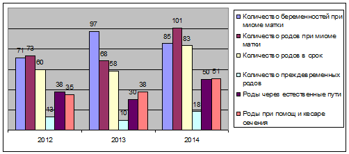 Данный график показывает, что количество беременностей с миомой матки возрастает каждый год, исход беременности различный. Родоразрешение может быть как через естественные родовые пути, так и оперативное и разница между ними минимальна. Зависит оно от размеров, положения и осложнений миомы. Так же видно, что при данном заболевании женщины большинство рожают в срок, как и при обычной беременности, однако присутствует малое количество преждевременных родов, но это не у всех. Следует вывод, что беременность с диагнозом миома матки не страшен, при своевременном посещении врача и выполнения всех его указаний. В таком случае вероятность развития какого-либо осложнения минимален. Следовательно, и родоразрешение будет более благоприятным для жизни женщины и малыша.