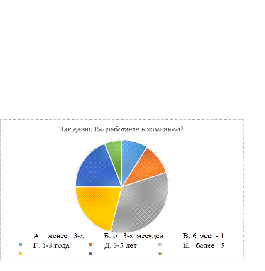 На основании данных, приведенных в рис. 5 можно отметить, что довольно малая доля сотрудников имеет стаж работы в компании более 3-х лет. К данной группе можно отнести персонал, занимающий руководящие должности (администратор и территориальный управляющий), а также сотрудники офиса. Намного больше доля сотрудников с меньшим стажем работы. Это обусловлено тем, что большинство сотрудников - студенты, и работа для них не является постоянной, это и объясняет довольно большую текучесть кадров в компании Calzedonia Group.