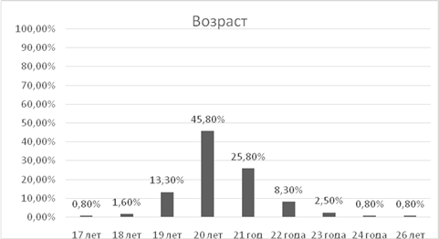 По возрастной шкале 45,8% преобладают студенты 20-ти лет, 21-летних составило 25,8%; 19-летних оказалось 13,3%; 22-летние составили 8,3%; 23-летние 2,5%; 18-летние 1,6%; 17-ти, 24 лет, 26 лет оказался одинаковый процент 0,8%. Наибольшее число респондентов были 20-летнего возраста.(Рис.2)