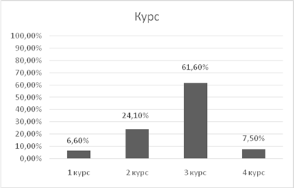 Большее количество студентов составили 3 курсы - 74 человека (61,6%), меньший процент составил 1 курс, их было 8 человек (6,6%). (Рис.3)