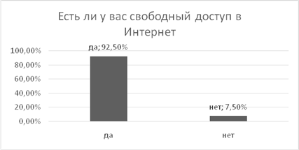 На первый вопрос «Есть ли у вас под рукой свободный доступ в Интернет» 111 человек (92,5%) ответили «да», 9 человек (7,5%) ответило «нет». Что говорит о том, что почти все свободно могут выйти в Интернет, у всех имеется смартфон, который им в этом поможет в любой момент.(Рис.4)