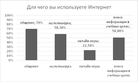 Для общения Интернет используют 84 студента (70%), 70 студентов (58,3%) использует Интернет для сериалов, музыки; 61 студент (50,8%) использует Интернет для поиска информации в учебных целях; 27 студентов (22,5%) использует для онлайн-игр. По результатам исследования выяснилось, что большее количество опрошенных используют Интернет для общения с людьми.(Рис.6)