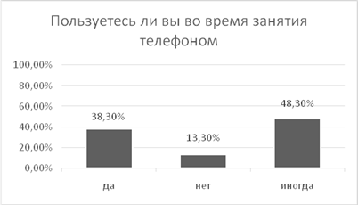 На вопрос «Пользуетесь ли вы во время занятия телефоном» 58 человек (48,3%) ответили, что пользуются «иногда», 46 студентов (38,3%) используют телефон во время пары, 16 студентов (13,3%) вообще не используют телефон во время пары. В большинстве, студенты пользуются своим телефоном во время пары.(Рис.8)