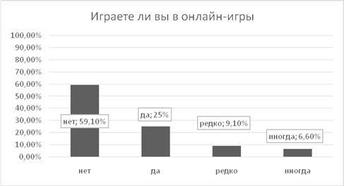 71 студент (59,1%) не играют в онлайн-игры, 30 студентов (25%) играют в онлайн –игры, 11 (9,1%) студентов «редко» играют, 8 студентов (6,6%) «иногда» играют. Как показало исследование, большинство респондентов 59,1% не играют в онлайн-игры. (Рис.10)