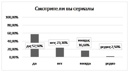 На вопрос «смотрите ли вы сериалы» 69 студентов(57,5%) ответили ,что смотрят. 28 студентов(23,3%) вообще не смотрят сериалы, что оказалось меньшинством. 20 студентов (16,6%) иногда смотрят ; 3 студента(2,5%) редко смотрит сериалы. (Рис.12)