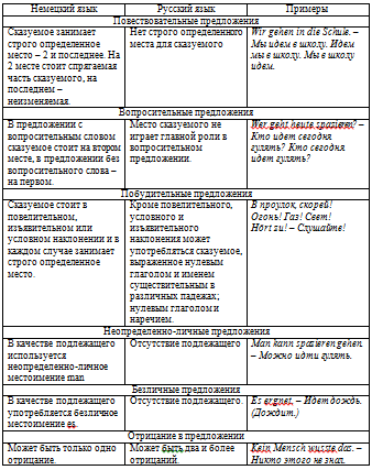 Таблица 1 Сравнительная таблица различий структур простого предложения в немецком и русском языке