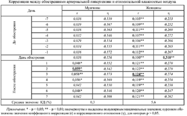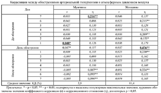 обострения артериальной гипертензии у женщин, по сравнению с мужчинами, в значительной степени связаны с изменением метеорологических факторов. Наибольшее влияние на обострение заболевания оказывает температура воздуха, атмосферное давление и относительная влажность воздуха.