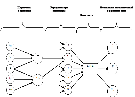 первичные параметры, характеризующие технологию, конструкцию и компоновку машин, уровень их эксплуатации, так, например, для производительности машин (стендов, приспособлений, линий и т.д.) первичными параметрами являются режимы и общая длительность операции или технологического процесса t = tpo, время холостого хода tx, внецикловые потери tH, число рабочих позиций q, длительность рабочего цикла l и суммарные внецикловые потери ∑tП;
