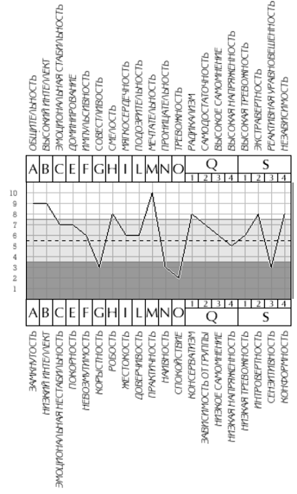 При высоких оценках - развитый самоконтроль, точность выполнения социальных требований. Человек следует своему представлению о себе, хорошо контролирует свои эмоции и поведение, доводит всякое дело до конца. Ему свойственна целенаправленность и интегрированность личности. В отличие от социальной нормативности поведения (фактор G), этот фактор измеряет уровень внутреннего контроля поведения.