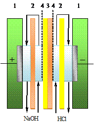 Растворы располагались таким образом, чтобы со стороны катионообменной мембраны в биполярной мембране находился раствор кислоты, а со стороны анионообменной мембраны щёлочь.