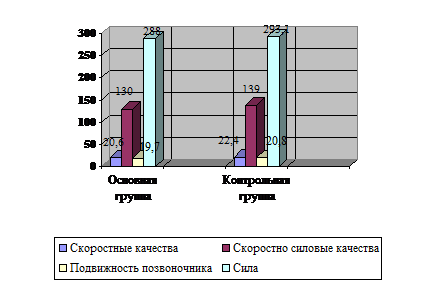 Как видно на рисунке 1, в контрольной группе показатели по скоростным качествам (22,4±2,1 сек) выше, чем в экспериментальной 20,6±1,8 сек. В результате тестирования учащихся на скоростно-силовые качества выяснилось, что в контрольной группе средний показатель равен 139,0±15,2 см, а в экспериментальной группе 130,0±14,3 см. По развитию подвижности позвоночника (по результатам теста на определение подвижности позвоночника) показатели контрольной группы (20,8±3,2 раза) выше экспериментальной (19,7±3,7 раза) на 1,1. Тест на определение силы выявил результаты в экспериментальной группе 288,0±44,1 см, и контрольной группе - 293,1±58,5 см. Таким образом, показатели развития физических качеств в контрольной группе несколько выше, чем в основной.