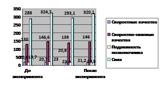 Можно сделать вывод, что после проведенных занятий в экспериментальной группе средний показатель увеличился на 0,1. Показатель равен - 20,7±1,5 сек. В контрольной группе показатель ухудшился с 22,4±2,1 сек на 21,2±1,1 сек. По результатам теста на определение скоростно-силовых качеств выяснилось что в основной группе показатели значительно улучшились на 16,6 см. Было - 130,0±14,3 см, стало - 146,6±16,1 см. Улучшились и в контрольной группе с 139,0±15,2 см на 146,0±16,2 см. Тест на определение подвижности позвоночника показал также положительную динамику в обеих группах: в основной - с 19,7±3,7 разана 23,0±3,8 раза, в контрольной - с 20,8±3,2 раза 23,8±3,2 раза.