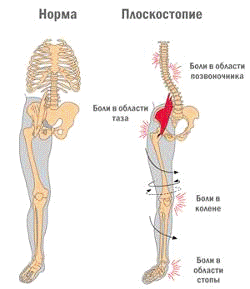 Плоскостопие - заболевание, следствием которого является быстрое утомление при ходьбе, боли в с стопах, коленях, бедрах и пояснице.