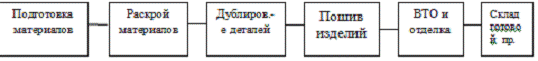 В первом случае в состав схемы производства входят следующие участки или цехи: подготовительный, раскройный, швейный, склад готовой продукции.