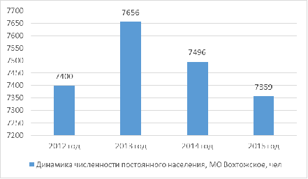 Главным ресурсом, от которого зависит функционирование и развитие любой территории, является население. По состоянию на 01.01.2015 г. общая численность постоянного населения муниципального образования Вохтожское составляет 7359 человек или 21,9 % от населения района (33580 чел) (рисунок 2.4).