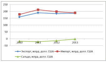 Таблица 2.1. Показатели экспорта импорта за период с 2010 по 2013гг.