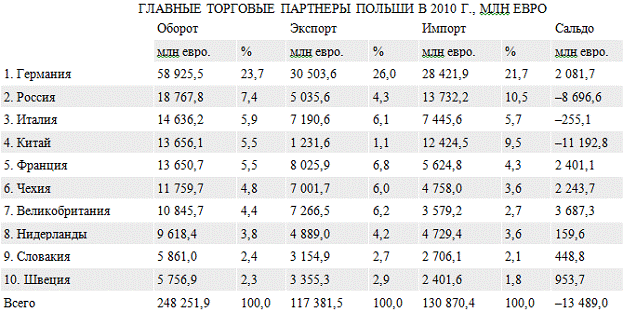 Основные покупатели продукции Польши в 2012г.: Германия (24,9%), Великобритания (6,8%), Чехия (6,2%), Франция (5,8%), Россия (5,5%). В 2012г. импортные товары в Польшу поступали преимущественно их следующих стран: Германия (20,9%), Россия (14,6%), Китай (9%), Италия (5%), Франция (3,9%). Польша в течение последних десяти лет стала важным торговым партнером для стран ЕС.