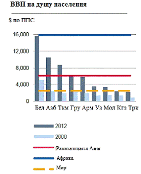 За последние годы объем ВВП на душу населения значительно вырос во всех странах СНГ. Опять же, особенно выделяются Азербайджан и Туркмения: с 2000 года в этих странах ВВП на душу населения увеличился более чем в четыре раза.
