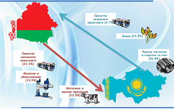 В экспорте Республики Беларусь в Республику Казахстан важнейшими являются средства наземного транспорта (22,3% общего объема экспорта Республики Беларусь в Республику Казахстан), машины и оборудование (19,9%), молочная и мясная продукция (13,5%). В экспорте Республики Казахстан в Республику Беларусь преобладают черные металлы и изделия из них (36,8% общего объема экспорта Республики Казахстан в Республику Беларусь), злаки (12,5%), средства наземного транспорта (6,7%).