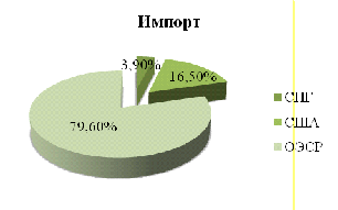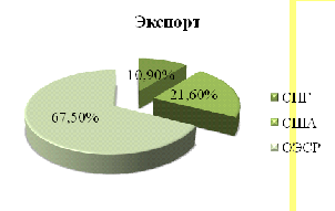 На начало 2013 г. российская доля в мировом объеме внешнеторгового обмена инновационными технологиями оценивалась меньше, чем в 1% (0,6%), для сравнения - доля КНР 16%. Но вместе с тем, в 2010-2012 гг. Россия осуществляла обмен инновационными технологиями с 79 зарубежными странами, в том числе с 50 странами ОЭСР и 6 странами СНГ. Среднегодовой объем экспорта российских высоких технологий в этот период оценивался в 43,8 млн.дол., что значительно уступало ведущим промышленно-развитым странам Франция - 1,8 млрд.дол.; США - 32,8 млрд.дол.). Объем импортных поставок инновационных технологий в 2010 г. составлял 57,7 млн. дол., увеличение в 2011 г. составило 3,8%, а в 2012 - 4,1%. При этом в географии экспортно-импортных поставок преобладающими были внешнеторговые сделки со странами ОЭСР, их доля которых составила соответственно 67,5 и 81,7% [17].