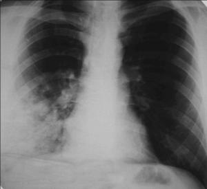 Рентгенологический признак пневмонии – инфильтративное, обычно одностороннее затемнение легочной ткани, которое может быть очаговым, сливным, сегментарным (рис.1-2), долевым (обычно гомогенным) и тотальным. Рентгенологическое исследование следует проводить в двух проекциях – задне-передней и боковой. При выполнении исследования следует оценить распространенность инфильтрации, наличие или отсутствие плеврального выпота и полости деструкции.