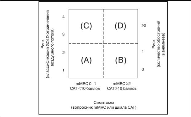 Примечание: При оценке степени риска выбирайте наивысшую степень в соответствии с классификацией GOLD ограничения скорости воздушного потока или с частотой обострений в анамнезе. GOLD, 2011.