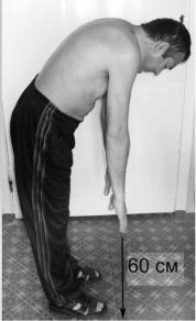 Со временем формируются стойкие ограничения движений во всех отделах позвоночника и, что особенно неблагоприятно, кифотические (сгибательные) деформации грудного («поза просителя»), шейного отдела, пояснично-крестцового. Для определения подвижности позвоночника существуют ряд тестов. Исследование симптомов Томайера и Шобера позволяют оценить подвижность поясничного отдела, а изменение дыхательной экскурсии грудной клетки – подвижность ребернопозвоночных суставов в грудном отделе позвоночника. Симпотом Томайера: больной наклоняется вперед и пытается достать пол вытянутыми пальцами рук, сомкнув ноги вместе и не сгиб ая их в коленных суставах. В норме расстояние между кончиком среднего пальца и полом составляет 0-10 см, а при болезни Бехтерева существенно больше (рис. 6- 5). Симптом Шобера: при наклоне больного вперед измеряют, насколько увеличилось расстояние между заранее отмеченными двумя точками – первая из них соответствует месту пересечения оси позвоночника с линией. соединяющей боковые углы ромба Михаэлиса, вторая располагается на 10 см выше первой. При полном сгибании в норме это расстояние увеличивается не менее чем на 4-5 см, чего не наблюдается при болезни Бехтерева. Дыхательную экскурсию грудной клетки измеряют на уровне четвертого межреберья на высоте вдоха и выдоха. Разность между полученными цифрами в норме не должна быть меньше 5 -6 см.