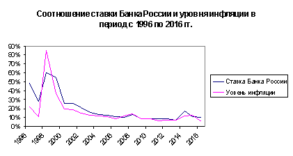 Помимо зарубежной практики, стоит вспомнить отечественный опыт. В 1990-е гг. был объявлен курс на развитие частной деятельности, на привлечение инвестиций, но при этом у российских предпринимателей не было возможности использовать один из важнейших инструментов развития бизнеса - кредит. В связи с очень высокой ставкой Банка России, которая относилась к издержкам производства у нас была отмечена довольно высокий уровень инфляции. Особенно заметна данная тенденция проявилась в 1992-1995 гг., когда инфляция достигла показателей, превыщающие 100% в несколько раз. При этом ставка Банка России имела показатели от 80% до 200%. Соотношение ставки Центрального Банка РФ и уровня инфляции в период 1996-2016 гг. отображено на рисунке 5. Данные взяты с официального сайта Банка России, а данные об уровне инфляции - со статистического портала «statbureau.org».