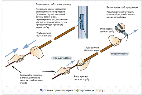 Протяжка провода происходит следующим образом. Конец кабеля привязывается к концу проволоки, а труба крепко обхватывается рукой. За другой конец проволоки провод протягивается сквозь гофру. Если кабелей несколько, то они привязываются одновременно, а труба при протяжке должна быть выпрямлена. На линии разметки отмечаются точки, в которых будут сверлиться отверстия под крепеж. Чаще всего при открытом способе прокладки гофры используются пластиковые клипсы, которые крепятся к потолку или стенам при помощи дюбель-гвоздей или шурупов.