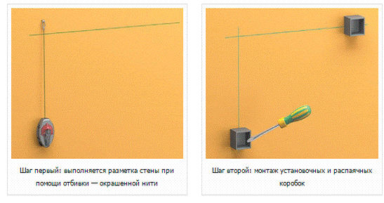 В любом случае первоначально чертятся линии, по которым будет проходить кабель. От потолка или пола отмеряется расстояние, на которое будут отстоять провода. При этом необходимо учитывать, что эта величина может быть уменьшена в зависимости от последующих работ, например укладки пола или монтажа навесного потолка.