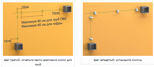 Трубы ПВХ монтируются точно так же, как и гофрированные. Они используются в подсобных и нежилых помещениях, где проводке требуется дополнительная механическая защита. Клипсы или другой вид крепления можно располагать реже, чем в случае с гофрированной трубой, поскольку трубы ПВХ хорошо держат размер и не прогибаются.