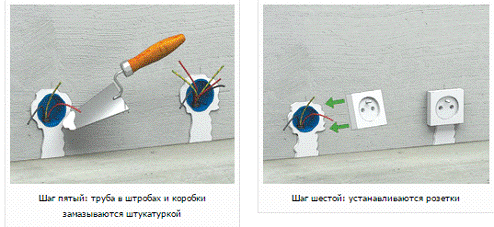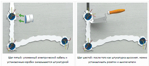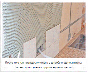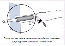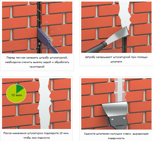 штукатурной смеси и наносить ее шпателем, вдавливая внутрь штробы. Затем