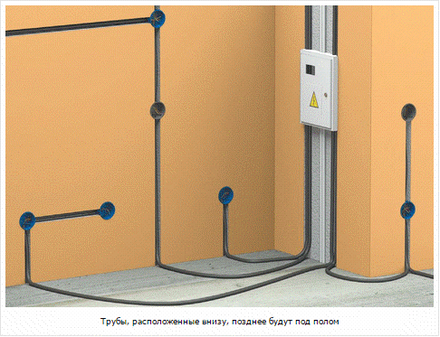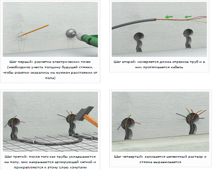 Есть вариант, когда проводка прячется в трубы и заливается цементным раствором - помещается под стяжку. Однако так делать не рекомендуется, особенно если слой раствора над трубой достаточно тонкий.