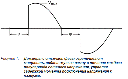 Почти во всех устанавливаемых в домах стандартных диммерах используется принцип отсечки фазы. Преимущество таких схем - простота и надежность. Схема обрезает часть синусоиды в каждом цикле переменного напряжения и, тем самым, меняет действующее значение напряжения, приложенного к нити накаливания (Рисунок 1). Это, в свою очередь, меняет световой поток нити. Поскольку для нагрева и охлаждения нити накаливания требуется сравнительно долгое время, такое переключение не заметно для человеческого глаза, за исключением, может быть, установки самых минимальных уровней. Существует два основных типа диммеров. Первый обычно выполнен на симисторе и отсекает фазу по переднему фронту синусоиды. Второй тип - транзисторный, в нем фаза обрезается относительно заднего фронта. Последние были разработаны для совместимости с емкостным входом электронных трансформаторов, используемых для питания низковольтных галогенных ламп.