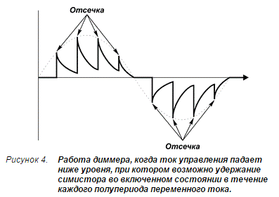 Для эффективной работы диммера необходимо обеспечить путь для протекания через нагрузку тока, заряжающего конденсатор при закрытом симисторе, и поддерживать требуемый уровень этого тока в течение периода переменного напряжения. Если диммером установлен очень малый угол отсечки фазы, то времени для зарядки конденсатора небольшим током будет достаточно. Однако при больших углах процесс зарядки может не успевать завершиться в течение одного полупериода переменного тока, поэтому симистор будет переключаться реже, чем ожидается (Рисунок 4).