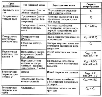 Акустические колебания характеризуются частотой, интенсивностью и видом. Виды колебаний в основном определяются свойствами упругой среды и способом их создания. В жидкостях и газах, обладающих упругостью объема, акустические колебания распространяются с одинаковой скоростью во всех направлениях. В твердых телах, характеризуемых помимо упругости объема еще и упругостью формы (сдвиговой упругостью) и неодинаковостью деформаций растяжение-сжатие по различным направлениям (для анизотропных тел), закономерности распространения акустических волн значительно сложнее.