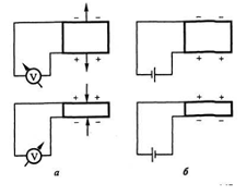 Наиболее распространенным является способ, основанный на явлении пьезоэлектрического эффекта. Физическая сущность этого эффекта заключается в том, что при механическом растяжении или сжатии на поверхности пластин некоторых твердых материалов появляются электрические заряды противоположного знака - возникает прямой пьезоэффект; наоборот, при подаче на поверхность пластин переменных электрических зарядов пластина начинает сжиматься и разжиматься - имеет место обратный пьезоэффект. Такими свойствами обладает ряд природных и искусственных материалов: кварц, турмалин, сегнетова соль, титанат бария, цирконат-титанат свинца (ЦТС) и др. Схема возникновения прямого и обратного пьезоэффекта приведена на рис. 1.