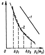 песчаной (1) и глинистой (2) породы под влиянием приложенного к ней давления ε = f(р)