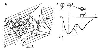 Молекулы любого вещества совершают тепловые трансляционные колебательные движения около временного положения равновесия, переходя скачками из одного положения равновесия в другое. Положению равновесия отвечает минимум энергии частицы. Основные положения теории трансляционного движения молекул вещества были сформулированы Я. И. Френкелем в 1925 г. В качестве структурной теории водных растворов они получили развитие применительно к проблеме формирования химического состава подземных вод в работах, а применительно к исследованию физических основ фильтрации воды в горных породах - в работе. Частица раствора, совершая трансляционное движение и соударяясь с соседними, накапливает некоторый запас энергии, который называется энергией активации Еа. Из одного положения равновесия в другое она переместится, если ее энергия активации E`а окажется больше, чем потенциальный барьер Ei под которым понимают максимум энергии между двумя соседними минимумами, соответствующими положениям временного равновесия данной частицы. На рис. 2.2, в на кривой потенциальной энергии молекулы А глубокий (левый) минимум отвечает взаимодействию молекулы воды А с ионом С (ион-дипольное взаимодействие) и временному положению равновесия, а правый (менее глубокий)-взаимодействию двух молекул воды А и В (диполь-дипольное взаимодействие) и следующему положению равновесия.