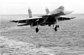 Истребитель корабельного базирования Су-33: размах крыла - 14,7 м; длина 21,19 м; высота - 5,63 м; масса макс. взлетная - 32 000 кг; макс. скорость на большой высоте -2300 км/ч; потолок - 17 000 м; дальность - 3000 км; вооружение - 30-мм пушка (250 патронов), УР; экипаж - 1 человек